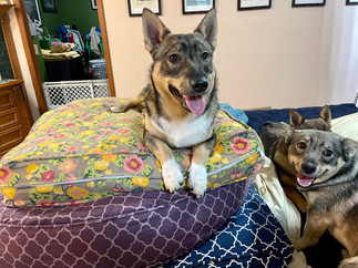 Since it was raining this morning, the Vallhooligans and Bridget assisted me in unpacking and setting out the new rugs on top of the clean old carpet. Celine approved of three dog beds with freshly washed covers stacked upon our king sized bed. Prins also enjoyed climbing Dog Bed Mountain. Dove rolled wildly on the cotton sheets to get the tiny bit of rain off her coat. Skadi was a good girl who took it all in from on top of Andy's pillows at the head of the bed. Bridget knew she actually is not allowed downstairs so she coyly tried to avoid being seen. She did not succeed, but I was in no mood to enforce the standing rule. It is for Bridget's own physical benefit not to go up and down those steep stairs, so she sleeps at night on the queen sized bed in the dog room. There is also an enormous dog bed and her crate to choose from, which has both a thick orthopedic dog mattress and a plush bumper bed on top, with a cotton towel to cuddle into. I set up a small gate in the entryway of the dog room at night, so Bridget can still see into the rest of the main floor. I can step over the gate, and so can she, but she respects it and stays in the dog room until Andy or I remove the gate every morning.