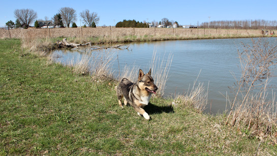 We had a fun family walk yesterday on the farm. It's nice to have so much room for the dogs to run and play, right in our own backyard. The grass greened up so much from the last time I took the camera along. Bridget enjoyed stretching her legs in the prairie, then went back in the fenced dog yard while we took everyone else into the pond pasture. One of our neighbors had a friend visiting that brought a shy dog. The dog came up to the fence several times and the Vallhooligans made all kinds of threats. Poor dog ran off. Seriously, who is scared of Prins? Even the farm cats won't run from Prins!
